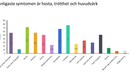 De tillfrågade uppgav att de vanligaste symtomen är feber, hosta, trötthet och huvudvärk. Andra symtom är värk i kroppen, snuva och halsont. För närmare 70 procent debuterade symtomen för mindre än två veckor sedan. Mer än hälften, 53 procent, uppgre att man har en pågående infektion.