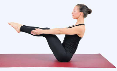 Utgå från skräddarställningen, böj in knäna mot bröstet och håll om dem med händerna. Hitta sittbenet och känn lyftet i magen och längden i ryggen. Kom långsamt över och balansera på sittbenen med fötterna i luften. Försök att få smalbenen så parallella med golvet som möjligt. Om det känns ok släpp taget om benen och fortsätt med att sträcka ut armarna rakt fram. Behåll en jämn och stadig andning, tryck benen mot varandra och håll dem aktiva. Behåll positionen under 3-5 andetag. Kom därefter tillbaka till sittande. Repetera 3-5 gånger.