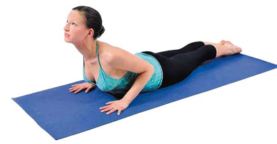 Ligg på mage med händerna tätt intill överkroppen i höjd med bröstet. För armbågarna tätt intill kroppen, ha ingen vikt på händerna. Tryck ihop och sträck igenom benen, så att knäna lyfter en bit från golvet. På en inandning, lyft upp i överkroppen, för blicken upp mot taket och behåll aktiviteten i mag-, rygg- och benmusklerna. Stanna här i 3-5 långsamma andetag, känn hur du för varje andetag lyfter högre upp och att armbågarna drar bakåt mot fötterna. Till slut vilar bara naveln lätt på golvet och benen lyfter en bit från golvet. På en utandning kom långsamt ner till liggande. Vila i några andetag och repetera en gång till.