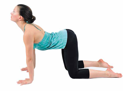 Börja på alla fyra och placera händerna i axelbredd och knäna i höftbredd. Håll ryggen parallell med golvet och nacken i linje med ryggraden. På en inandning, svanka och för blicken upp mot taket (som på bilden). På en utandning, runda ryggen och för hakan in mot bröstet, fäst blicken mot naveln. Utför rörelsen lugnt och kontrollerat och repetera 5-10 gånger.