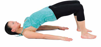 Börja liggande på rygg. Placera fotsulorna i golvet, hälarna höftbrett isär i linje med knäna. På en inandning tryck ifrån med fötterna och lyft bäckenet högt upp mot taket, aktivera sätesmusklerna och behåll en stark mage. Låt inte knäna öppna upp till sidorna utan behåll en parallell position med fötterna och knän. Stanna i positionen 3-5 andetag, på en utandning kom försiktigt ner, kota för kota. Vila emellan och repetera 2-5 gånger.