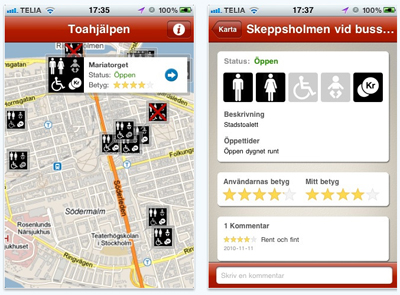 Toahjälpen är ett smidigt program som hjälper dig att hitta närmaste toalett, öppettider, avgifter, handikappsanpassning och så vidare. Man kan även sätta betyg på den toalett man varit på och skriva ett omdöme.