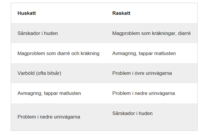 Till skillnad från huskatter drabbas raskatter däremot inte i lika stor utsträckning av bölder och smärta i rörelseapparaten och trolig orsak till det är att de utsätts för färre yttre skador. Däremot föreligger en lika stor risk hos huskatter som raskatter att drabbas av hudtumörer och tandsjukdomar.