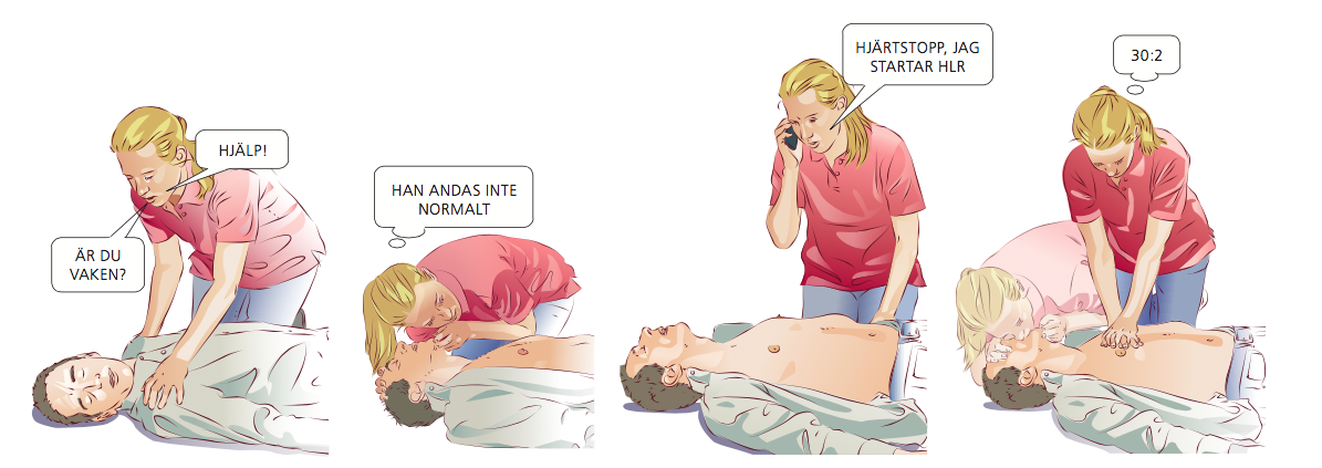 HLR utförs med omväxlande 30 kompressioner och 2 inblåsningar.