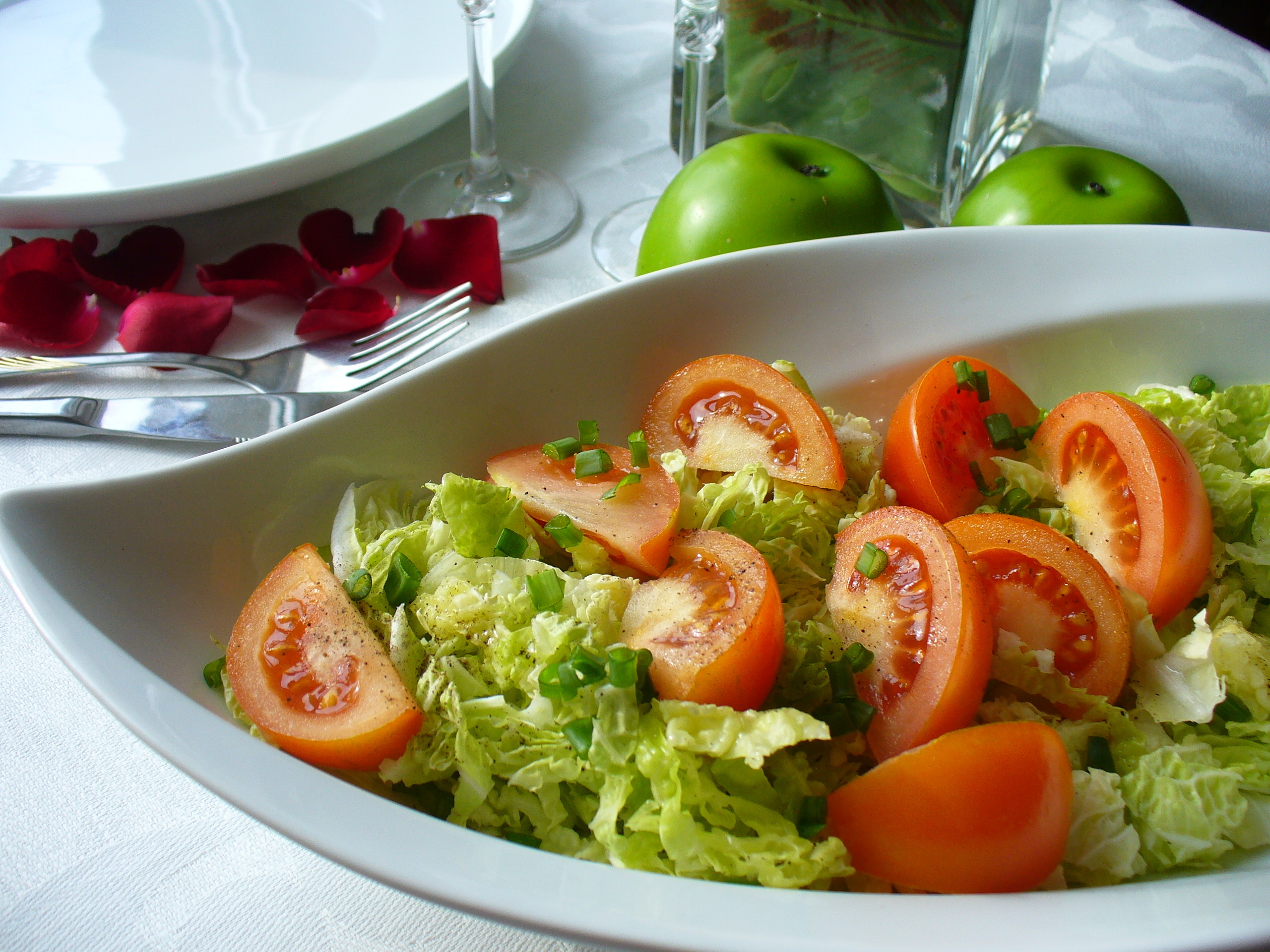 Skölj och riv salladsbladet. Skölj och skiva tomaterna, strimla salladslök och dadlar. Lägg upp grönsaker, dadlar och nötter i en skål eller på tallrikar.