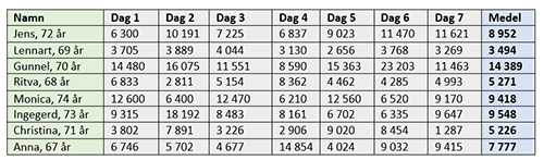 Siffrorna visar ett blandat resultat och att vissa seniorer är mer aktiva än andra. Endast en av testpersonerna har medelvärde över 10 000 steg. Det är även det värde Världshälsoorganisationen WHO rekommenderar och motsvarar ungefär 6 km promenad per dag.