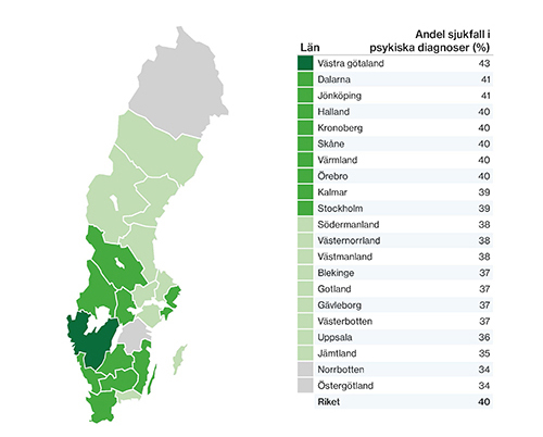 Psykisk ohälsa är vanligast i Västra Götaland med 43 procent av andelen sjukfall, följt av Dalarnas och Jönköpings län på 41 procent.