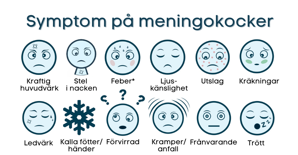 Det snabba sjukdomsförloppet gör att den som drabbats behöver omedelbart omhändertagande på sjukhus, med snabbt insatt behandling. I bilden nedan ser du de vanligaste symtomen på meningokockinfektion. Har man tre eller fler symtom bör man skyndsamt söka vård.