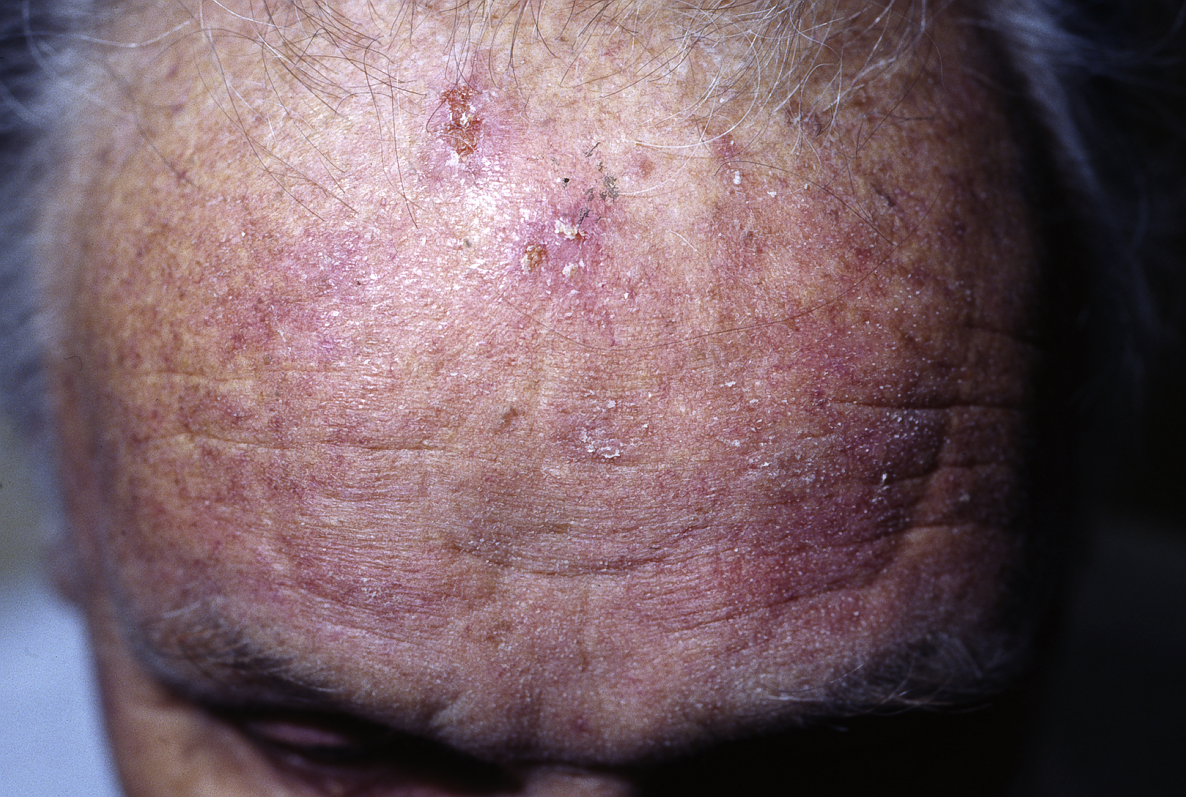 Utbredda förändringar av aktinisk keratos. Vanligt med solskador på flinten på grund av stor solexponering.