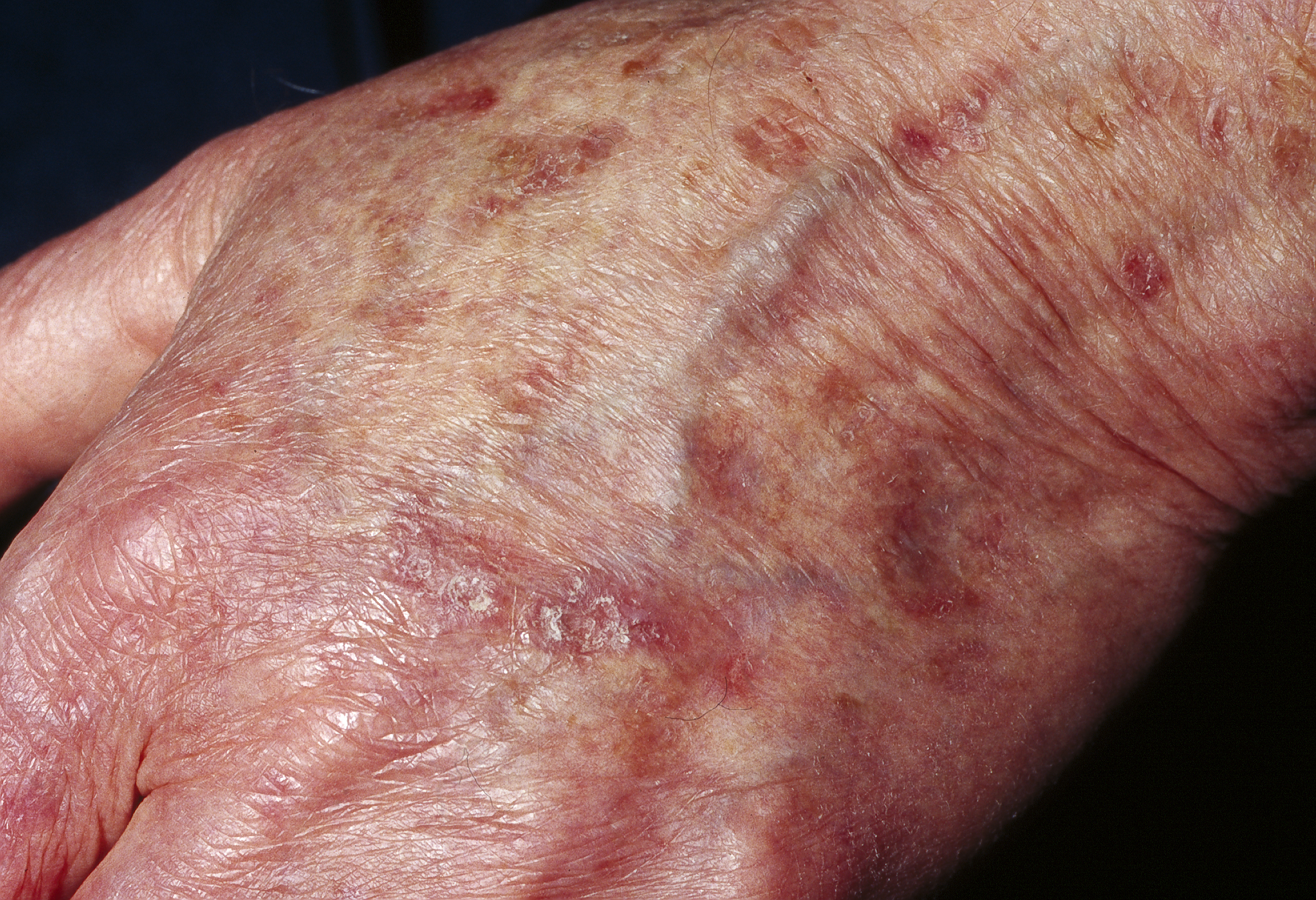 Aktinisk keratos på handryggen. Vanligt hos utomhusarbetare.