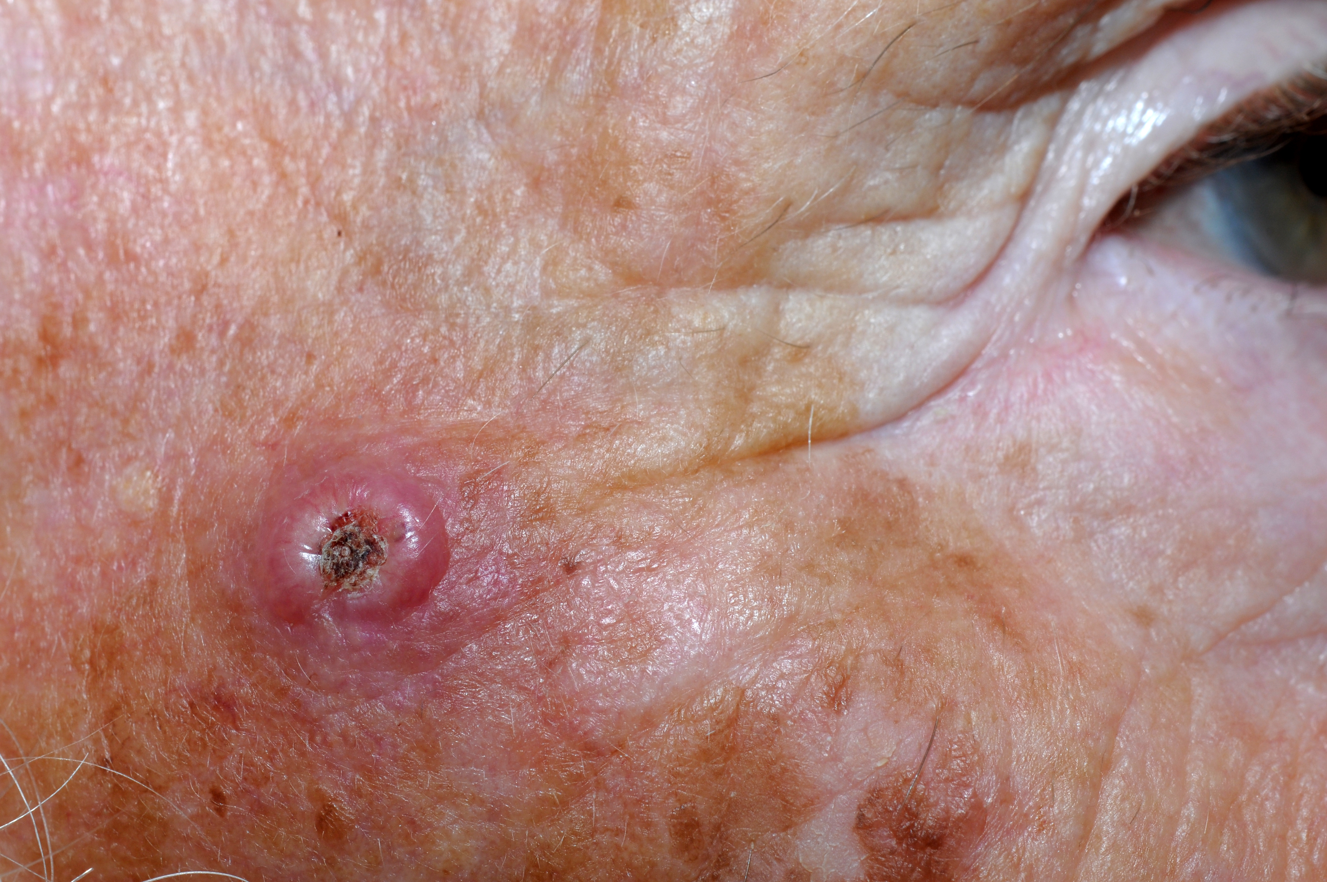 Basalcellscancer är en lindrig form av hudcancer som inte bildar dottertumörer. Det ser ut som hudfärgade knutor.